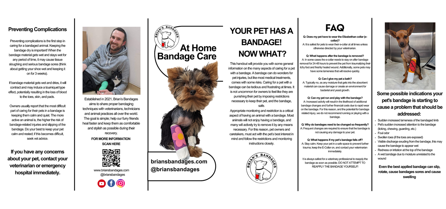 Provides answers to frequently asked questions, highlights key things to watch for, and offers clients additional resources for at-home bandage care, including pet enrichment ideas and a deeper understanding of the bandaging process.